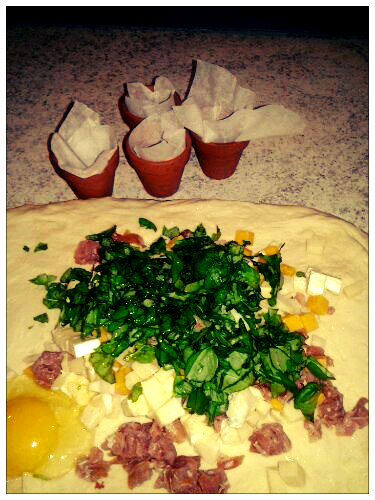 Gæret opløses i vandet. Herefter tilsættes alle de øvrige ingredienser til dejen og dejen æltes grundigt. Dejen hæver herefter i 30 min. Når dejen har hævet færdig tilsættes ost, æg, basilikum og skinken. Ingredienserne æltes god ind i dejen, som nu bliver våd. Nu skal dejen i forme eller blot på en bageplade. Jeg anbefaler at man putter bagepapir i lerpotterne, så brøde er nemt at få ud.