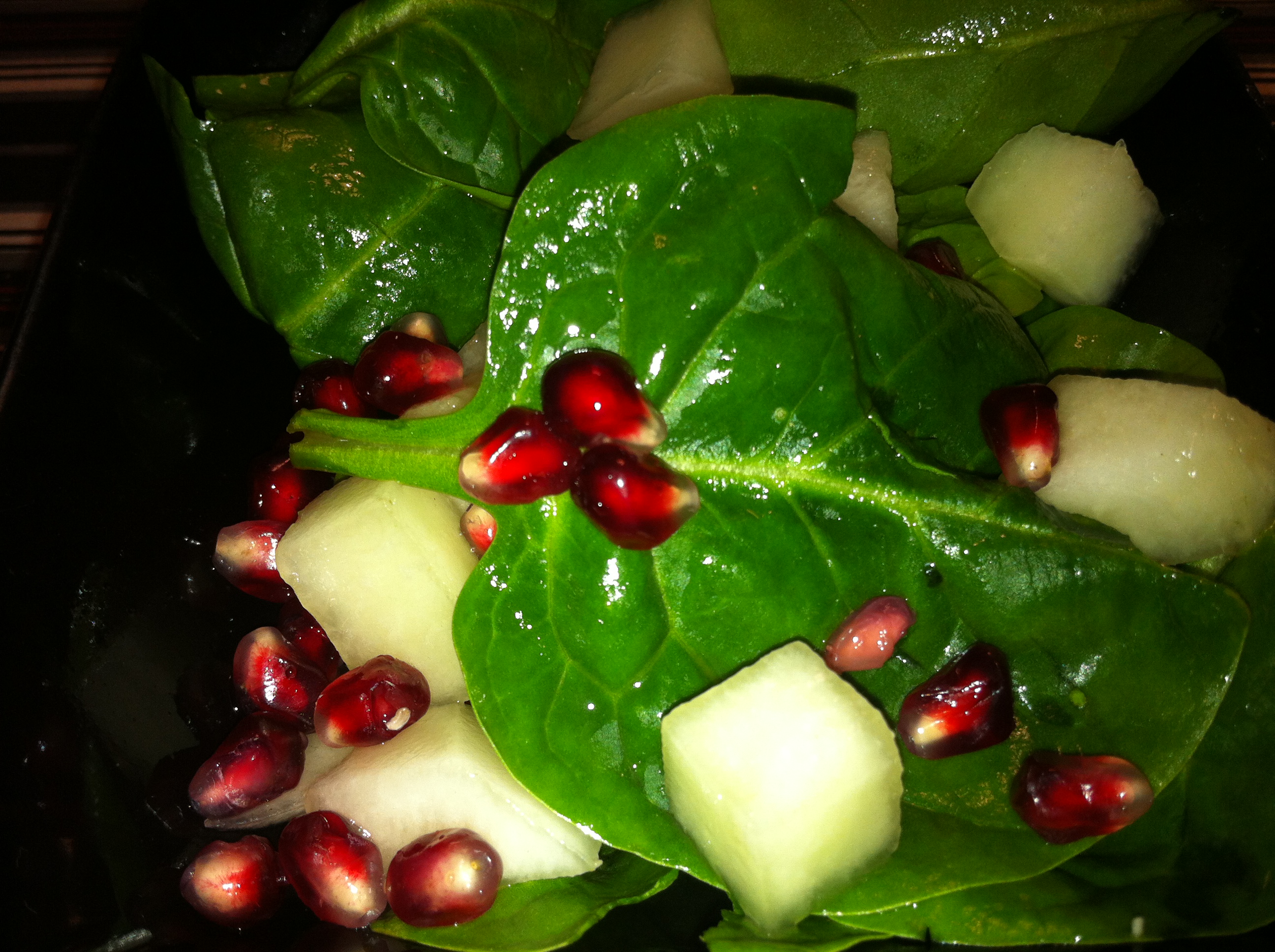 Her får du en nem salat som smager himmelsk. Den gør sig glimrende til en hel kylling fra weberen, en kyllingefilet og retter med hvid fisk. Salaten i sig selv giver et hav af smagsindtryk. Spinaten giver en let bitterhed, melonen en frisk sødme og granatæblekernerne giver en skøn struktur og giver fantastisk modspil med sin skarpe syre. Endeligt rundes smagsoplevelsen af med olivenolien med citron. Det skal simpelhen prøves.