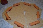 Sådan gør du: Gæren opløses i det lunkne vand i en skål. I en anden skål blandes mel og smør. Herefter tilsættes de øvrige ingredienser til melblandingen – også gæropløsningen. Ælt massen til en fast dej. Dejen hæver derefter lunt i ca. 30 min. Dejen skæres til 3 lige store boller og rulles ud som en pizza. Dernæst skæres ”pizzaerne” ud i 7 ca. lige store dele. Tilsæt en tsk. Sennep/ketchup til hver del (i den brede ende) og en halv pølse. Pølsen rulles herefter ind i dejen – start med den brede ende. (se billede 2). Gentag til du har brugt al dejen. Pølsehornene hæver herefter yderligere 10 minutter. Pensl pølsehornene med æg eller mælk og bag dem i ovnen ved 200 grader (varmluft) i ca.15 min.