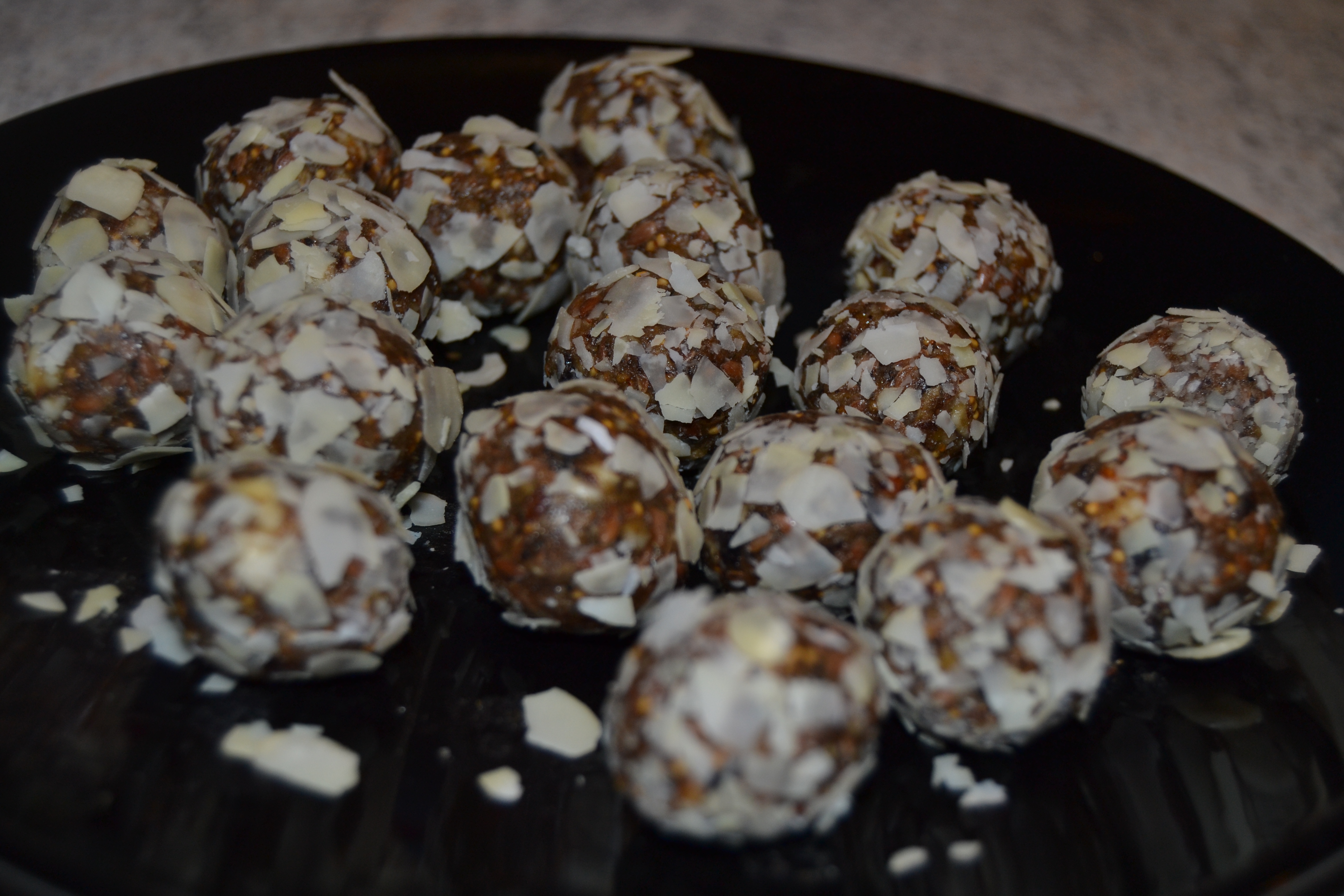Hak figner, rosiner og mandler ved at køre dem gennem persillekværnen (hvis du har sådan et old-school redskab), ellers kan en blender eller en skarp kniv også klare det. Kom de hakkede frugter og nødder i en skål og tilsæt smør og frø. Ælt massen sammen og rul den til små kugler. Tril til sidst kuglerne i mandelflager.