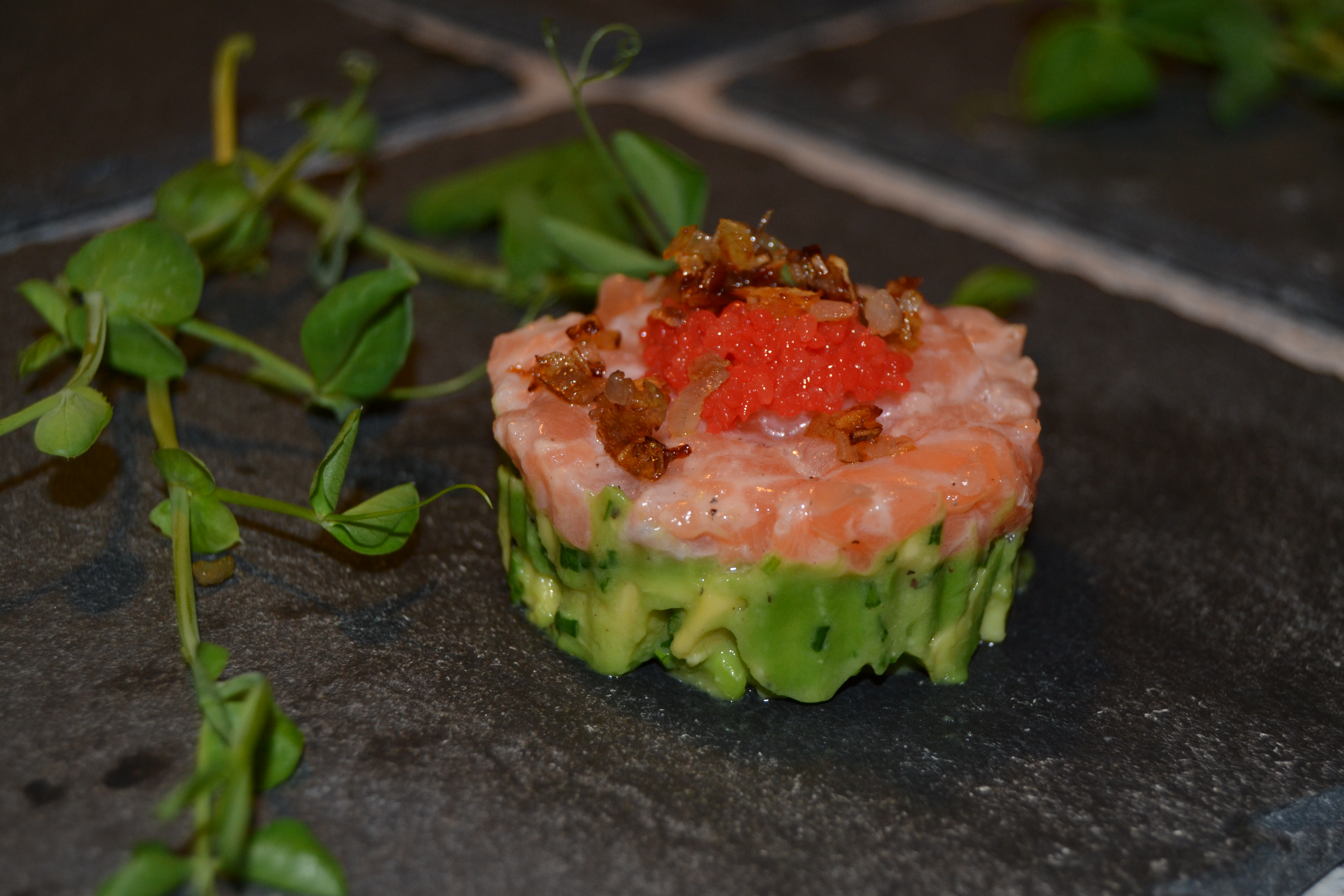 Vi fejrede endnu en gang året der gik sammen med madklubben, som endnu en gang har overgået sig selv! Wauw, vil jeg bare sige. Det hele var SÅ lækkert. Skønne mennesker, dejlig vin og en fantastisk menu. På forhånd var der delt opgaver ud, således vi ikke pludselig stod med 6 desserter, men selve menuen blev først røbet på selve dagen. Mine ansvarsområder denne aften var en forret og kransekagen (som jeg helt ærlig var meget nervøs for, men det kan du læse som i et andet indlæg). Forretten bestod af laksetatar med avocado og ærteskud. Opskriften får du her: