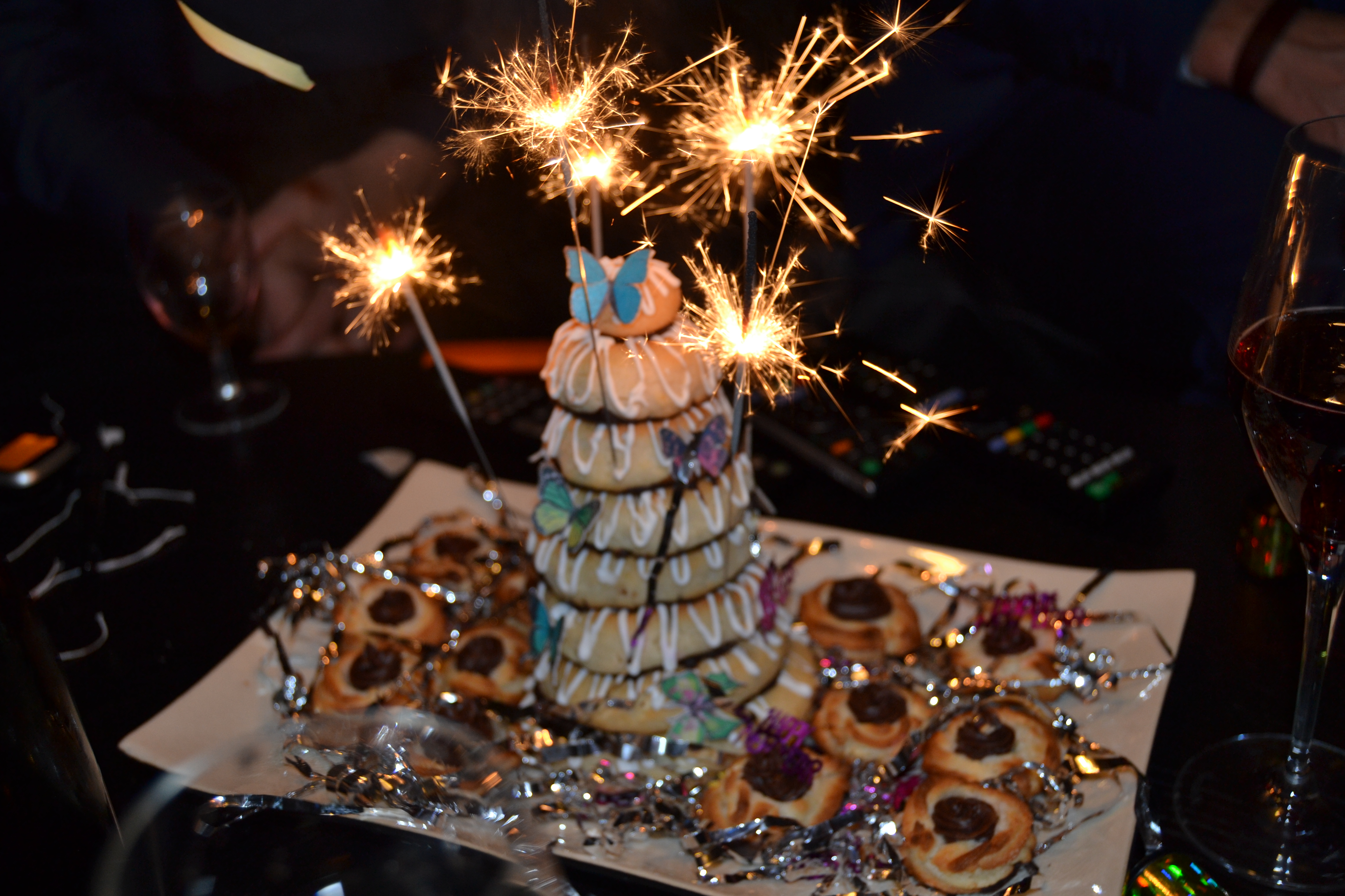 Her kommer nytårsopdatering nummer to. Efter en skøn middag nærmede klokken sig 12 og den stod på kransekage. Jeg gav kagen et lille twist ved at blande pebermyntearoma i glasuren og lakridspulver i den mørke chokolade…og det kan klart anbefales. Pynten bestod af stjernekastere og spiselige sommerfugle. Herudover var tårnet omringet af små kransekagetoppe med chai-ganache.