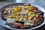 Når meatzabunden er færdig fordeles tomatsovsen ovenpå. Herefter kan du “pynte”´din meatza efter egen smag. Bag meatzaen yderligere 10 minutter ved 200 grader eller til osten er gylden. Jeg puttede følgende på min meatza: champignon, frisk mozzarella, chilihaloumi og gul peber som bagte med i ovnen. Efterfølgende kom jeg frisk basilikum, skåret spinat, san marzano tomater og endeligt et par dråber trøffelolie på.